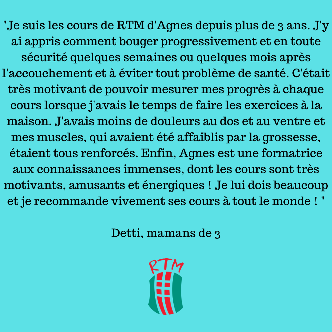 "La méthode RTM, c’est une attention particulière et personnalisée, des résultats motivants, une aide disponible également en ligne, un peu de temps libre actif pour la mère après l'accouchement."