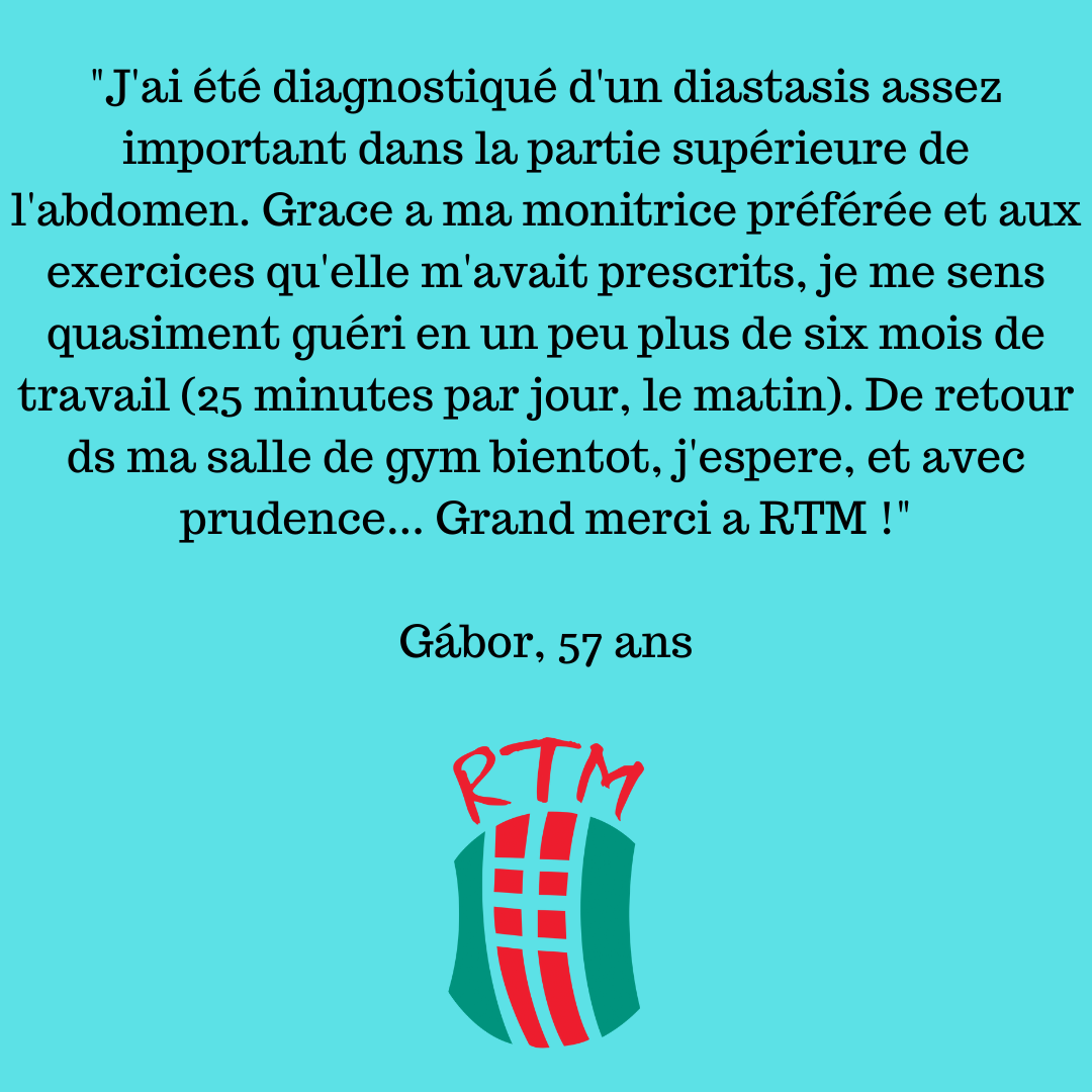 Le RTM est une méthode développée par un coach (Renáta Tőkés) et un médecin (Dr. Tímea Kerekes), la première méthode soutenue par un médecin et un coach. Dans les pratiques RTM, les muscles abdominaux droits sont entraînés en activant les muscles abdominaux latéraux, empêchant ainsi un surplomb supplémentaire du tissu conjonctif. Le RTM est un entraînement très bien construit car il sollicite progressivement les muscles abdominaux qui n’étaient pas utilisés pendant la grossesse, en tenant compte des changements post-partum et des problèmes individuels. Ils commencent les cours par un examen correct, qui comprend également la prise en compte de la hernie. Il met également l'accent sur le suivi afin que les exercices puissent être facilement personnalisés. Une gymnastique qui convient pour de grandes et petites distances. De sérieux résultats ont été obtenus jusqu'à présent, seulement les publications se font attendre. Sur la base de ma propre expérience, ils se tournent vers leurs clients avec beaucoup de soin. De plus, ils éduquent également les clients car le tissu conjonctif des patients atteints de RAD s'est allongé et ne revient plus à son état d'origine. Les patients doivent donc faire face à ce problème pour le reste de leur vie, en apprenant une posture et un entraînement appropriés. Sur la base de tout cela, je le recommande vivement à toutes les femmes et tous les hommes qui souffrent de diastasis abdominal."